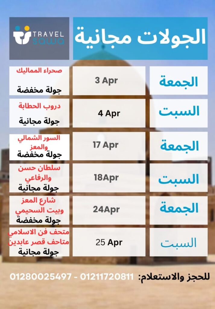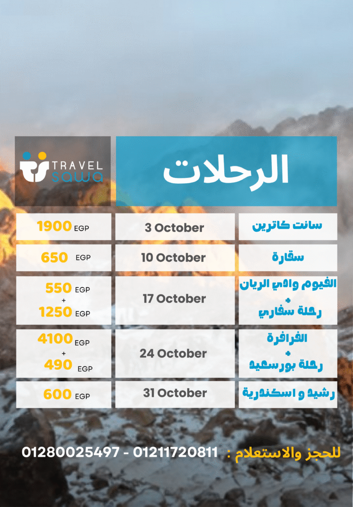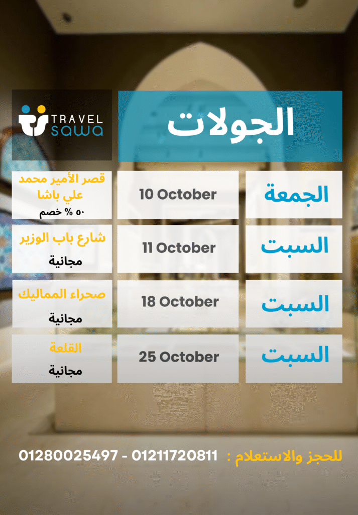انضم إلى مجتمع ترافل سوا واستمتع بإمكانية حصرية للمشاركة في جولات ثقافية مجانية ورحلات داخلية مميزة إلى أجمل وجهات مصر، من الكنوز الخفية والمدن التاريخية إلى التجارب المحلية التي لا تُنسى – كل ذلك مصمَّم ليقرّبك من مصر الحقيقية من خلال سفر أصيل وتجربة مليئة بالمعنى.