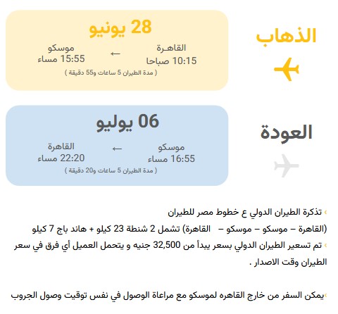 - تذكرة الطيران ذهاب وعودة على الخطوط مصر للطيران تشمل شنطتين 23 ك + هاندباج 7 ك ( يتم تسعير التذكرة و تأكيد الحجز بعد دفع مقدم حجز الرحلة و يمكن للعميل حجز تذكرة مستردة و يتحمل غرامة إلغاءها في حال رفض التأشيرة أو إلغاء حجزه)