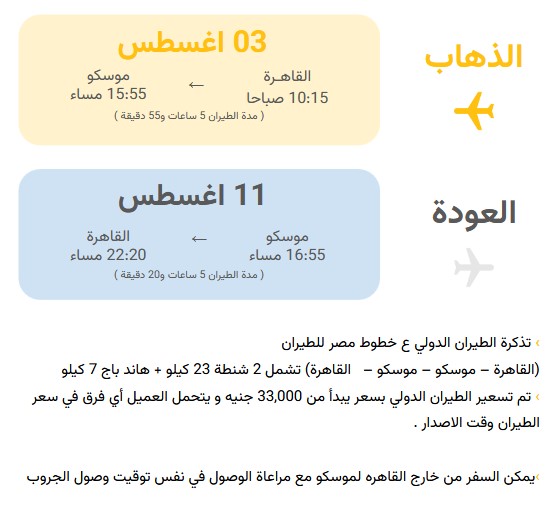 - Round-trip flight ticket with EgyptAir, including two 23 kg bags and one 7 kg hand luggage (the ticket price and booking confirmation are provided after paying the trip deposit, and the client can book a refundable ticket, bearing the cancellation fee in case the visa is denied or the booking is canceled).